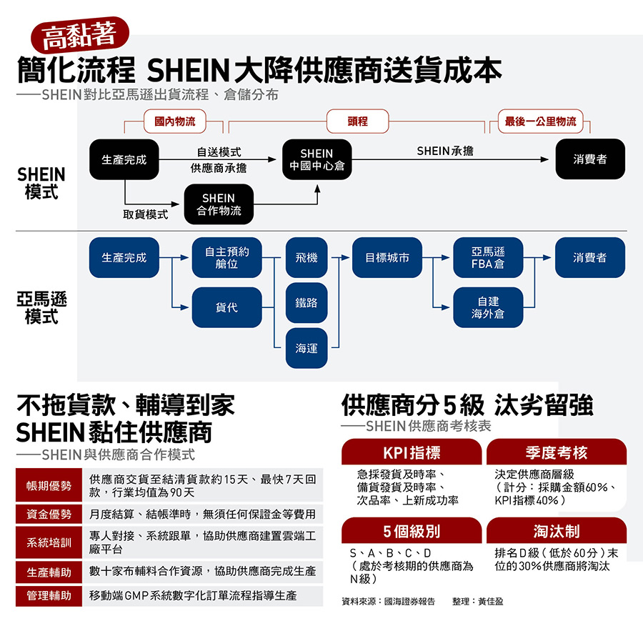另外,據中國媒體普遍揭露的數據顯示,希音原則上是每季進行一次供應商考核,其中供應商「採購金額」占六成,KPI(關鍵績效指標)占四成,在KPI中,又進一步細分「急採發貨(即急單)及時率」、「備貨發貨及時率」、「次品(即不良品)率」與「上新(即上架新款式)成功率」等四個項目。