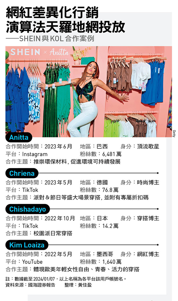 據悉,希音不僅在Instagram、臉書、X(推特)、Pinterest、TikTok等海外重要社交平台上創建帳號,而且針對不同國家和地區市場、不同的服裝產品類型,在主帳號下,甚至還創建了八十多個子帳號,形成所謂的「帳號矩陣」,由主帳號對子帳號引流,每個子帳號專門服務特定的目標客戶,並透過與各國網紅(KOL)合作,達到對粉絲用戶的差異化行銷。